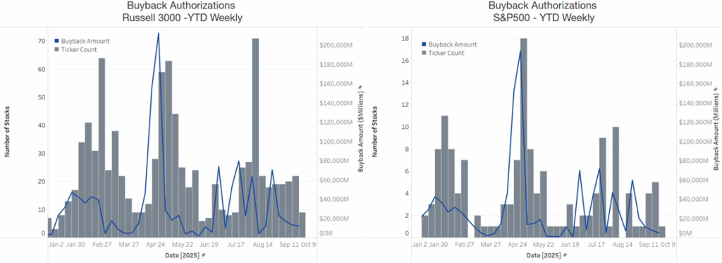 - EventVestor: U.S. authorizations have surpassed $1.3T (fastest pace on record) for Russell 3000; could reach $1.5T by year-end. Assuming a 90% execution rate means $1.35T actual executions (a record). S&P 500 companies have seen $1T authorizations YTD. Keep an eye on this dynamic after reported Q3 results.