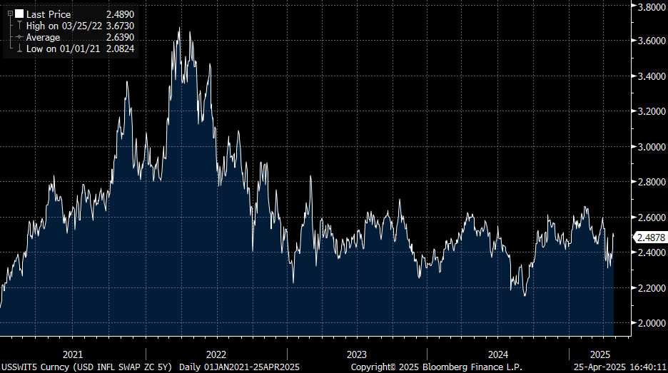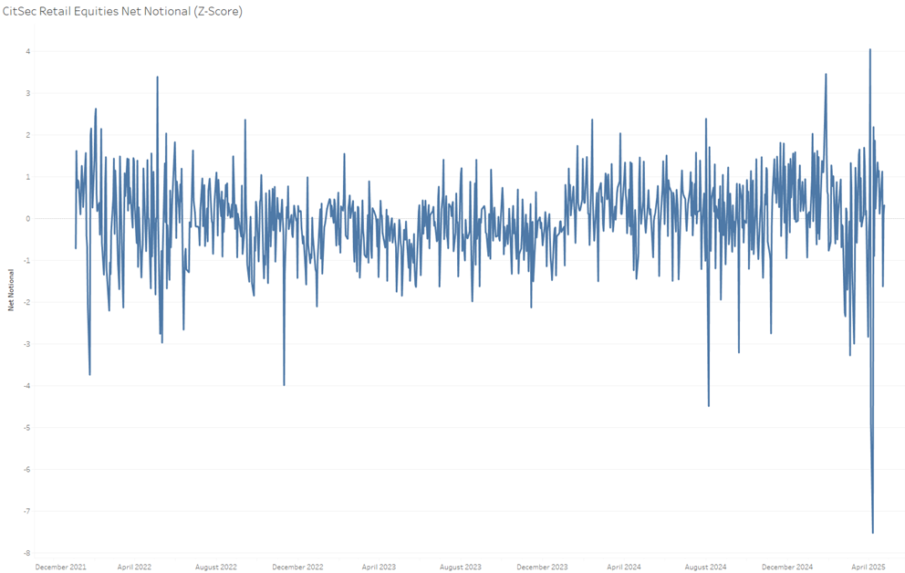 WHERE DOES THAT LEAVE MARKETS? The course correction on Fed independence and tariff rhetoric has sharply reduced the extreme tail risk for markets. Relative to the growth outlook, US long-end rate valuations are attractive – risk-off correlations were neutralized by the combination of increased term-premium and sale of US assets narrative. If those risks are now somewhat diminished, the more traditional dynamic can reassert itself and long end rates can rally materially. The same can be said of UST swap spreads. Month-end should also be supportive. Moreover, there is some expectation in the market for issuance adjustments in the upcoming Quarterly Refunding Announcement (QRA)…whilst it’s difficult to reduce issuance in any meaningful way given the fiscal outlook, there is a chance of a few clever tweaks to take the pressure of long-end bonds, such as more long-end buybacks or hints of a future shortening of WAM. Ultimately, this is yet another reminder that fiscal authorities remain the dominant force in determining market pricing, rather than their monetary siblings…something which I have argued has been the case since the 2020-Covid era. Whilst rates markets can exhibit risk-premium compression, the same cannot be said for equities and fx, in my opinion. We’re still staring down the barrel of a wholesale re-evaluation of global trade and with it the risk of a sharp slowdown in both US and global growth…this is not an environment that’s conducive to valuation multiples and earnings projections, both of which continue to remain elevated. So, whilst we can see sharp rallies at the index level around positive headlines, the medium-term outlook remains challenging, at least until we get much further clarity on where tariffs land (to provide certainty for businesses) and the economic implications thereafter (which will determine Fed policy). Interestingly, our own flows at Citadel Securities continue to show retail buying appetite over recent weeks, after experiencing the largest day of net selling that our retail platform has seen in over three years on 7 April. Since then, in aggregate our retail flows show that net buying has nearly surpassed how much was sold between 3rd and 7th April during much of the tariff-driven volatility (chart below; h/t: Thomas Sozzi). For the dollar, the reliability of the US as a trading partner remains diminished, and with it, investor appetite for US assets. This is not only a natural consequence of less dollars that need to be recycled back due to reduced trade deficits…but also a simple reflection of the fact that US economic growth is likely to underperform in coming quarters under current policies. US exceptionalism is a multi-faceted construct based on a combination of factors – both blunt and nuanced – cheap energy, world class R&D across sectors, global talent, and deep capital markets. Ecosystems are delicate by nature and thrive on a fine balance between their many interconnected parts. Risk it at your peril. I expect the US dollar to remain under pressure. Where there is value is inflation markets…as outlined above, in most tariff scenarios, realized inflation will trend upwards from here…and unless the Fed acts to control this, one can expect inflation expectations to ultimately reflect this. 5Y inflation swaps are at 2.50%, barely above target for the Fed (in CPI terms)…this is largely driven by the fact that inflation tends to trade in correlation to risk assets, which have been under pressure. I believe this represents good medium-term value in most outcomes.