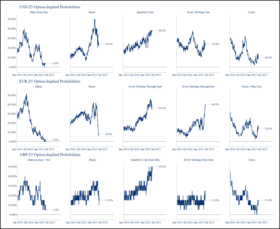 THE FED REMAINS ON THE SIDELINES FOR NOW. The playbook for stagflation is tough…let alone one that incorporates high levels of government policy uncertainty. The market is not incorrect to price 86bps cuts by the end of this year…this is just a weighted average of various plausible outcomes (charts below; h/t: Grant Wilder). Given the landscape outlined above, my sense is that the Fed will wait as long as possible – perhaps through summer – until they have more clarity on tariff policies and the economic implications…knowing they can cut aggressively and deeply should the data warrant. Chair Powell will not want to be the first central banker in decades to lose control of US inflation. Following this week’s back-track, he has the upper hand.