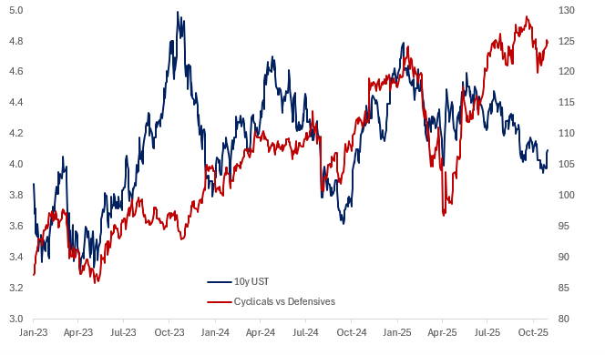 ONE OF MY OFT-STATED VIEWS IS THAT EQUITY MARKETS HAVE BEEN PRESCIENT ABOUT THE POSITIVE FORWARD GROWTH OUTLOOK AND EARNINGS EXPANSION FROM AI INTEGRATION…whereas bond markets have over-indexed to spot labour market weakness and the expectation of an overly dovish Fed reaction function. This week’s FOMC meeting was a timely reminder that a persistently dovish Fed is not a done deal and the subsequent sell-off in rates was overdue given rich valuations – something I wrote about last week. As mentioned, long-end rates are acting as the release valve for FCI. If we take estimates of the relative weights of stocks vs bonds embedded within a typical FCI framework, then make some assumptions around continued equity market performance, we can back out how much 10y rates need to move to keep FCI constant. Using Scott Rubner’s historical seasonality estimates – SPX typically rallies 3% from November through to year end – FCI would ease a further 14.5bps, other things equal…but to keep FCI the same, 10y yields would need to rise 32bps. As a reminder, the recent 6m easing in financial conditions has been especially large…I’d even say post-recessionary in nature…with the ~70bps of easing worth approximately the same in terms of real GDP impact. The natural next question is: if 10y rates selloff 30-40bps, is that a problem for equity markets? A sharp, violent move higher in yields would certainly be disruptive…but my sense is that a steady move higher due to reduced concerns around unemployment and economic growth (rather than immediate inflation risks) – from rich valuations – would not be harmful to corporate earnings growth and momentum.