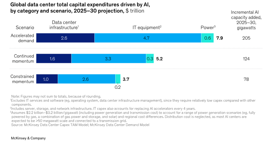 AN IMPORTANT PUSHBACK TO THE BEARISH DURATION VIEW IS THAT AI WILL BE A LARGE DEFLATIONARY FORCE. This is a big call to make…whilst it’s certainly possible in the long-term, the short-term impacts remain unclear and are not yet enough to be a market driver. For now, the capex and associated data centre build out may have the opposite effect on rates markets. Take for example this week’s $30bn bond issuance by META…which was 4.5x oversubscribed and the 5th largest IG issuance in history…whilst easy to brush off by looking at subscriptions, if these deals keep coming, investors should be open to the idea that IG issuance will weigh on global bond duration. The scope of this theme shouldn’t be underestimated…we are on track for the largest amount of IG issuance in history for the month of November, as well as the largest Q4 issuance month ever. Escalating capex volumes could lead to a flood of bond issuance that the market finds increasingly tough to digest. Whilst it’s hard to pin down an exact number, estimates for 2026 IG issuance look like they will be in the region of $1.6-1.7tn, likely an increase of around 5-10% YoY. An interesting McKinsey study suggests that the investment requirement into AI data centres could potentially reach $7tn by 2030…that’s an extra $1.4tn per year (including 2025) or the equivalent of nearly an entire year of US IG issuance. Of course, not all of this will be debt funded, but bond bulls should beware that as AI investment proliferates beyond the hyperscalers, there will be less earnings from which to fund capex, which means more debt. More debt means more duration…and we already sit at rich valuations. There is an additional concern Jeff Eason highlights: the expected ROI of AI capex projects will not be deterred by a 25-50bp change in cost of capital…something Chair Powell himself referred to. Watch this space.