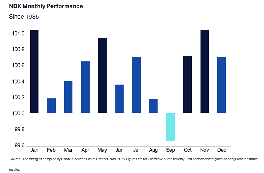 BLOW OFF TOP…is the phrase Scott Rubner and I have been using the most to describe the equity markets outlook (including in our Cross Asset call). Alphabet, Meta, Microsoft and Amazon all beat Q3 EPS estimates and each lifted guidance for AI capex spend, reminding us that these companies see this as existential to their future operating model. Scott flags some key upside factors: the previously mentioned seasonality analysis suggests the risks are tilted towards a powerful rally through to the end of the year. The Nasdaq has risen 12 of the past 13 Novembers (averaging +3.8%!), and our franchise flows show 26 consecutive weeks of net bullish retail option demand (remember this community is THE price setter in the market now). US corporates are also on pace to authorize a record $1.3 trillion in buybacks this year…once reporting season ends, the buyback window reopening is a historically supportive flow dynamic, and with vol resetting lower our systematic models predict mechanical re-leveraging demand. This all comes at a time when institutional discretionary exposure remains light, creating the risk of investors getting ‘stopped-in’ to buy as the market grinds higher. These bullish undercurrents in our flow of funds analysis coincide with a macro context that needs to rerate growth higher. The labour market looks to be improving…we have the composite tailwind of fiscal and monetary stimulus in the pipeline (combined these could be worth between 1-1.65% of GDP depending on which estimates you take)…risk appetite indicators aren’t stretched…and we are about to go through the Wall St economic forecast season during which every “year ahead outlook” will need to ask the hard question of why they’re assuming a persistent drag from tariffs and uncertainty when retail risk appetite is this ferocious and our flow metrics are euphoric.