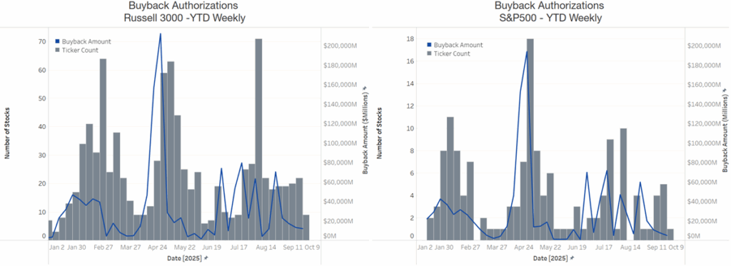 - EventVestor: U.S. authorizations have surpassed $1.3T (fastest pace on record) for Russell 3000; could reach $1.5T by year-end. Assuming a 90% execution rate means $1.35T actual executions (a record). S&P 500 companies have seen $1T authorizations YTD. 139 S&P 500 companies announced a buyback authorization in 2025.