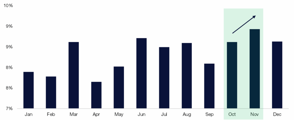 Citadel Securities’ Retail Options client volume typically rebounds into the final quarter of the calendar year. Activity picks back up in Q4, with November the strongest month of the year.