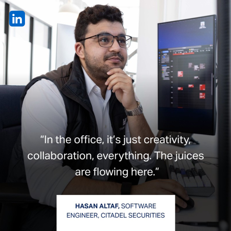 1/14View the PostCitadel Securities Chief People Officer Alex DiLeonardo and software engineer Hasan Altaf discussed the many advantages of our in-office culture on a recent episode of the Vox podcast “Today, Explained.”